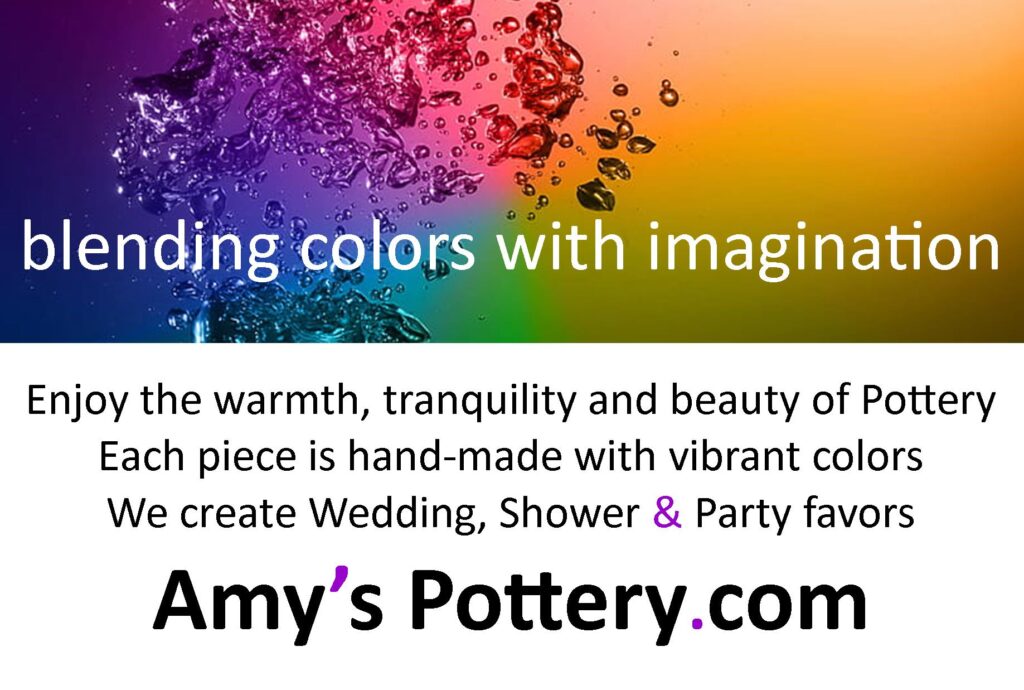 Our offerings are centered around the idea that boring and medicore is at the big box retailers but if you want something more colorful and unique then amysPottery is where you should be shopping. Check out our plates, candles knick knacks and more. +If you have an idea for a wedding favor, let’s see if we can meet your creative expectations through had throwing or via a slip cast mold. Thanks for visiting Amy’s Pottery and more.